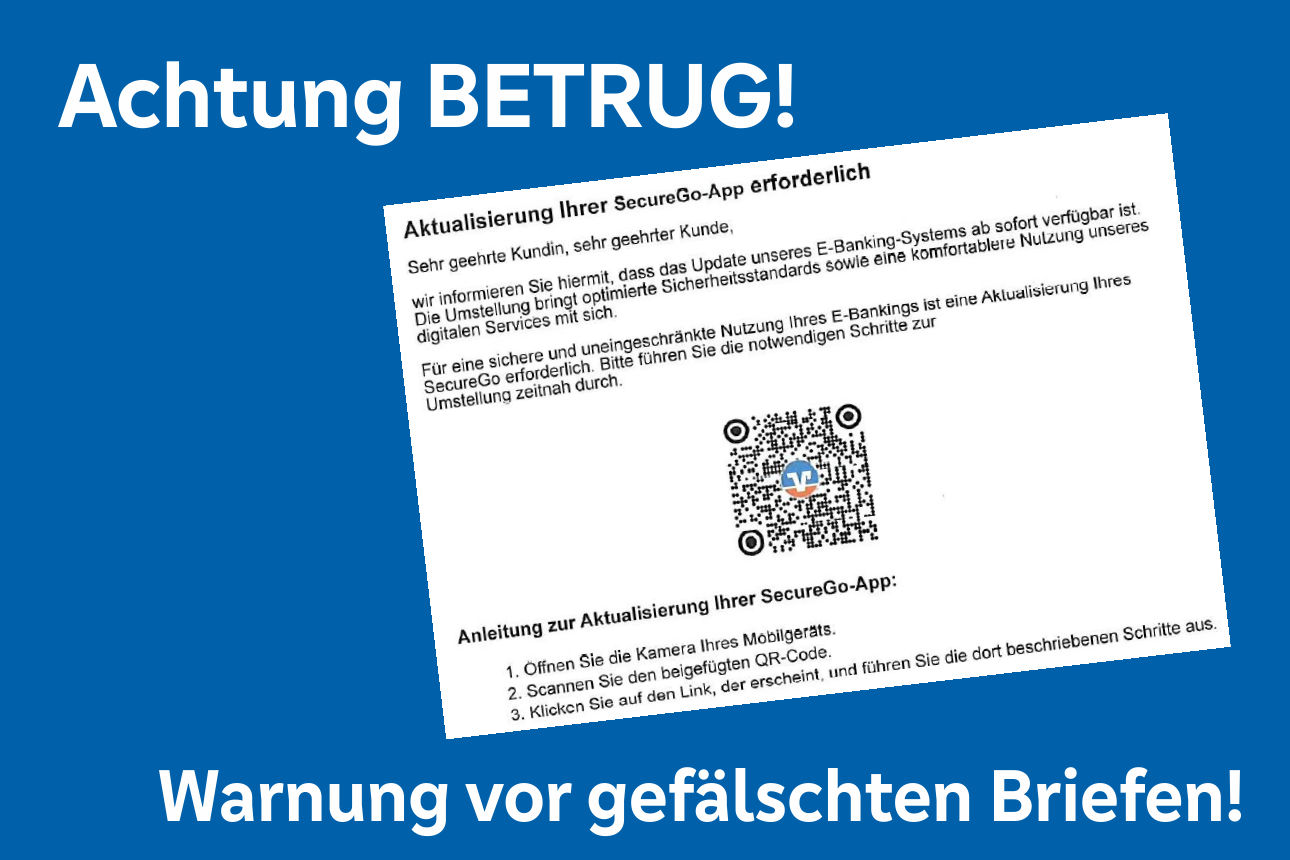 Betrüger verschicken gefälschte Briefe mit einem QR-Code, um angeblich das TAN-Verfahren zu aktualisieren oder zu reaktivieren. Bitte NICHT einscannen!